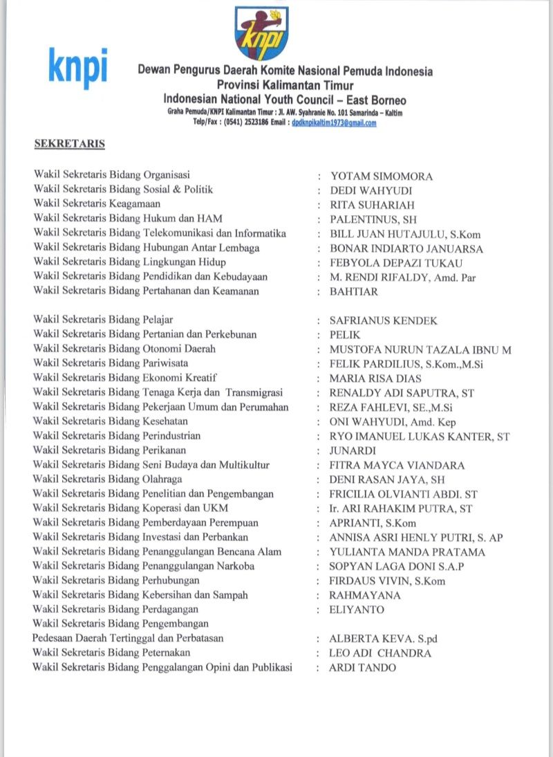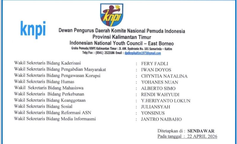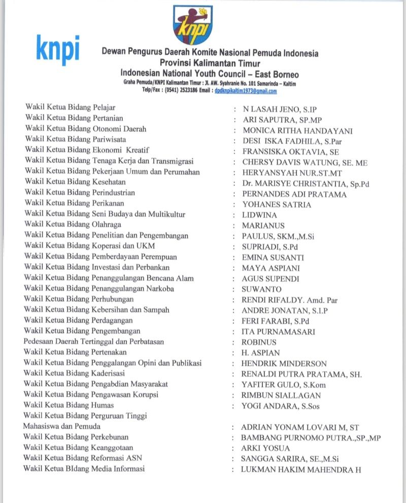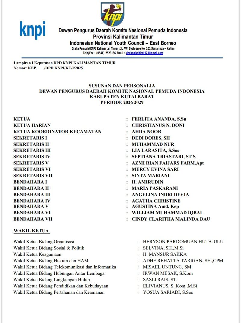 Berikut Daftar Pengurus KNPI Kutai Barat Periode 2026-2029 :