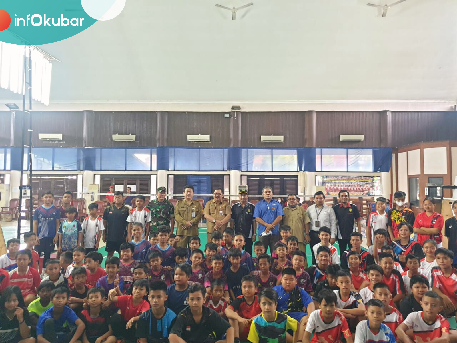Sahadi bersama atlet junior peserta Kejurkab Bulutangkis di BPU Tanaa Purai Ngeriman. (Foto: Istimewa)