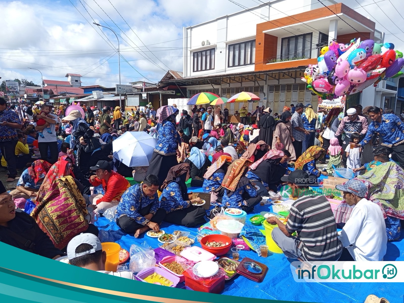 Sejak pagi, area festival telah dipadati warga dari berbagai kampung. Deretan hidangan yang disusun panjang menjadi pusat perhatian. Begitu aba-aba dimulai, masyarakat duduk bersisian dan menyantap makanan secara serempak.